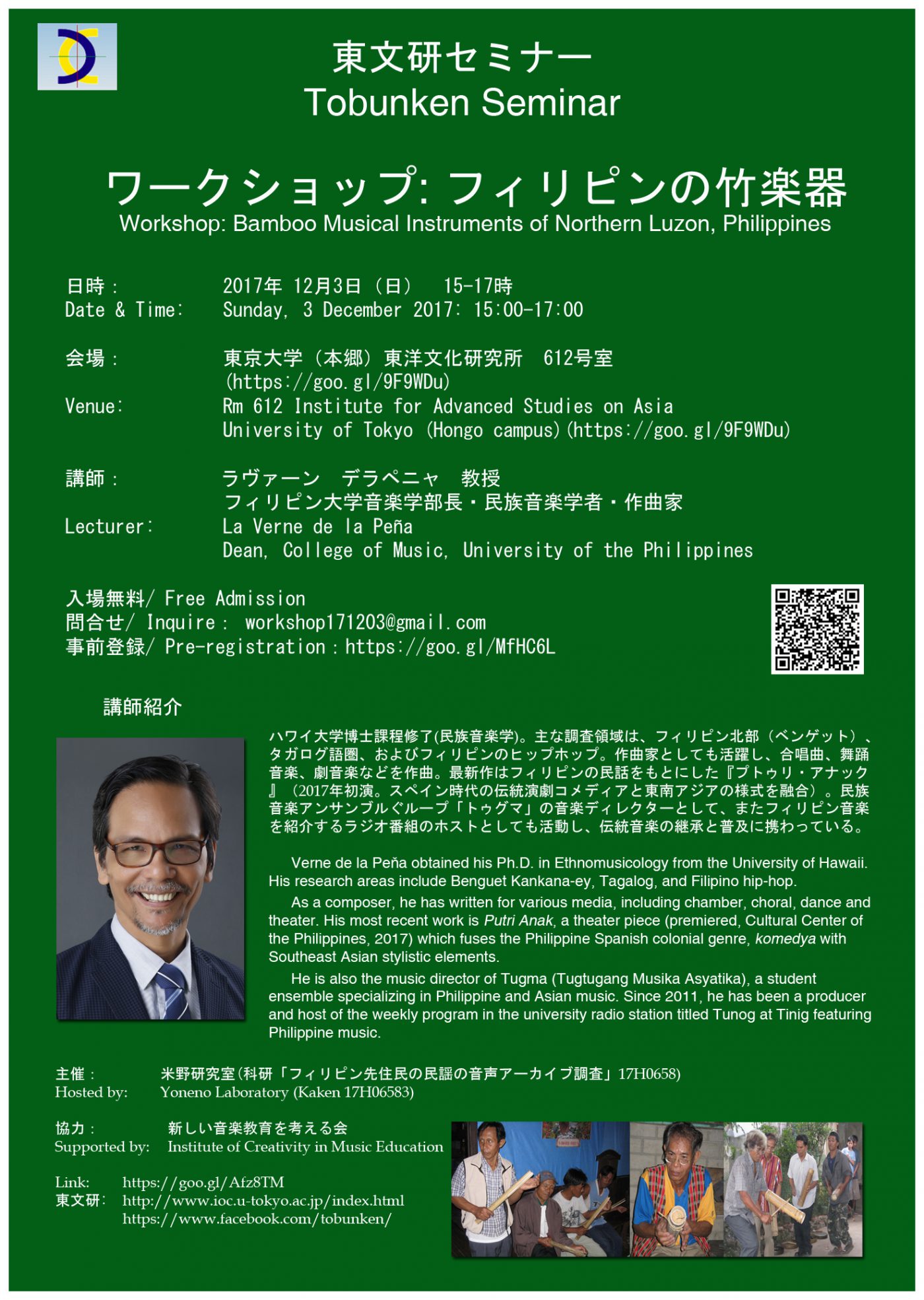 2017年11月23日 ガレージ・ゼミにゲストとしてきていただいた米野みちよ先生から、 12月3日、フィリピンのデラペニャ先生によるワークショップのご案内がありました。参加ご希望の方はチラシ中の事前登録をご覧ください。 Tweet